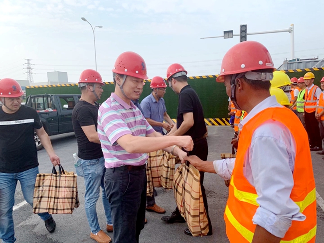 8月21日下午,開(kāi)發(fā)公司副總裁劉建華帶隊(duì)慰問(wèn)市政工程項(xiàng)目現(xiàn)場(chǎng)工人,給他們送去毛巾、香皂、洗發(fā)水等防暑降溫用品,感謝他們對(duì)園區(qū)市政工程的建設(shè)作出的貢獻(xiàn)。
