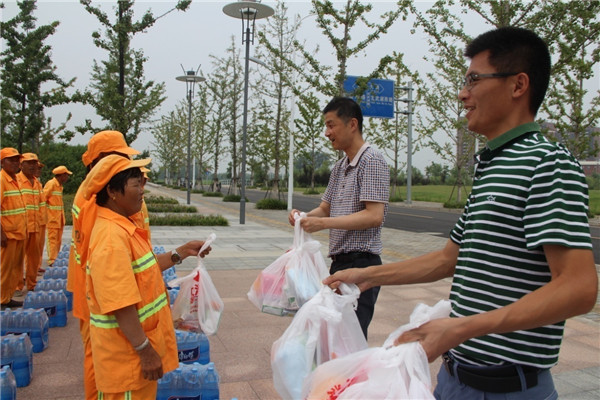朱亞楠表示,園區(qū)環(huán)衛(wèi)工人頂著烈日,為恒大集團(tuán)等園區(qū)企業(yè)創(chuàng)造了整潔、優(yōu)美的城市環(huán)境,他代表恒大集團(tuán)宿遷項(xiàng)目全體人員向他們致以誠(chéng)摯的敬意和謝意。許紹杰也對(duì)奮戰(zhàn)在一線的環(huán)衛(wèi)工人表示感謝和祝福,多次叮囑他們高溫作業(yè)要注意安全,勞逸結(jié)合。